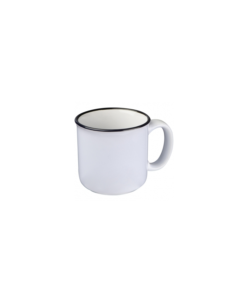 kubki ceramiczne do kawy stylizowane na stare emaliowane kubki. Są białe z ozdobnym czarnym rantem. Mają praktyczną pojemność - 300 ml. Świetnie nadają się do codziennego użytku. Są to gadżety reklamowe przeznaczone do zadruku o dużej powierzchni.